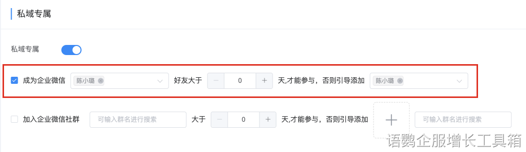 语鹦企服除了签到功能外,还有「大转盘/九宫格抽奖」和「砸金蛋」功能,其中「大转盘/九宫格抽奖」支持仅社群内好友参与,在语鹦后台也可设置中奖规则、概率等条件。让社群内的客户有专属感的同时也能防止他人薅羊毛。