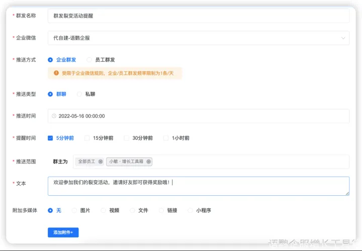 同时企业也可使用第三方工具语鹦企服的【定时群发SOP】功能,相比较企业微信自带的群发功能,语鹦企服还可以做到定时发送,管理员设置好群发内容和时间后,到点系统回自动发送给各员工或群主同时群发,员工一键确认即可发送,可以大大提高了客户营销的效率,并且保证了通知的及时性,大大减少了手动发送会产生的失误操作。