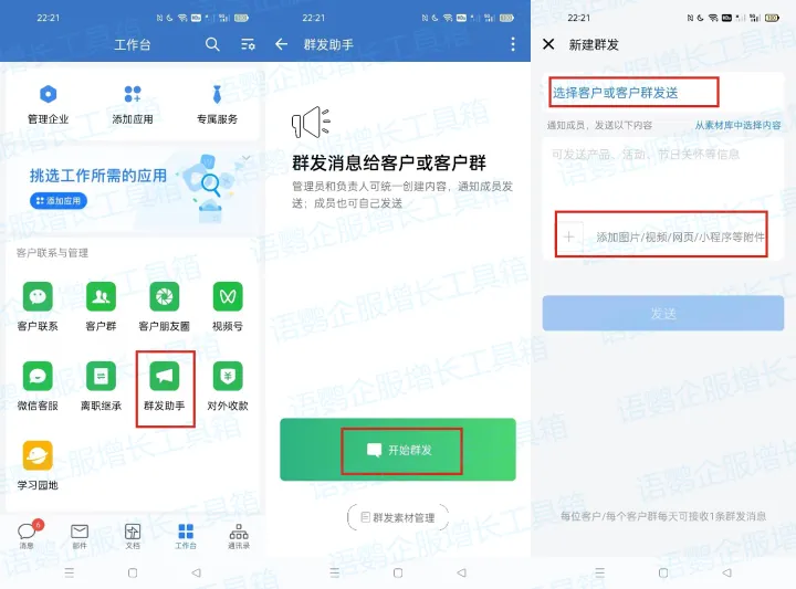 企业微信有【群发助手】这一功能,当有必要的活动通知、节日祝福时员工可以把这类消息批量发给各个客户或客户群,或者由管理员编辑好发送内容,通知员工一键群发。文字、图片、视频、小程序等均可群发给客户。