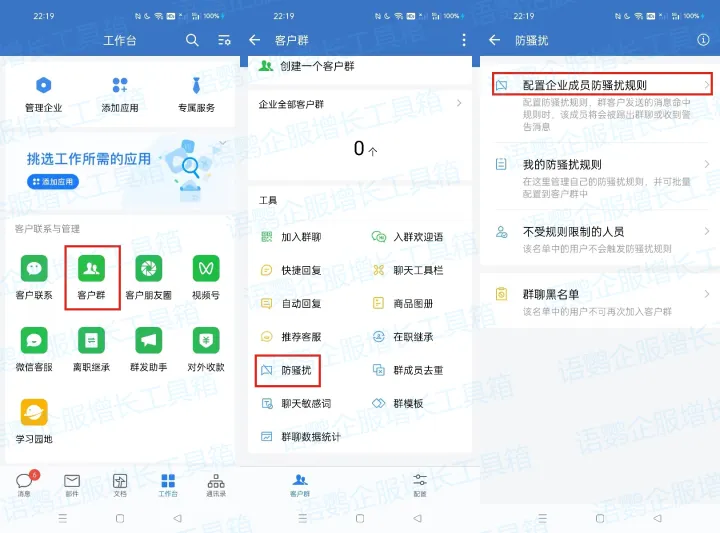 企业微信有非常全面的防骚扰功能。企业可在【手机端->工作台->客户群->防骚扰】中统一配置成员的防骚扰规则。成员可以在【工作台->客户群->防骚扰】中的防骚扰规则页面将防骚扰规则配置到客户群,或选择自己的客户群,在群资料页面开启防骚扰,一个客户群支持设置多条防骚扰规则。可以有效防广告、防刷屏,防止其他企业员工进群。