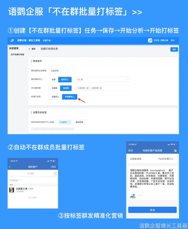 企业微信自带的功能里并没有自动打标签的功能,企业只能通过第三方工具箱来实现自动给客户打标签的目的。例如,语鹦企服的【在群/不在群批量打标签】功能,只要创建好打标签的任务并开始分析,系统就会给在群/不在群的客户批量自动打标签,还可以在打完标签后,使用标签群发和社群定向邀请的功能。企业可打开语鹦企服工具箱中的【在群/不在群打标签】的应用,选择右上角【创建任务】,即可开始创建打标签任务。