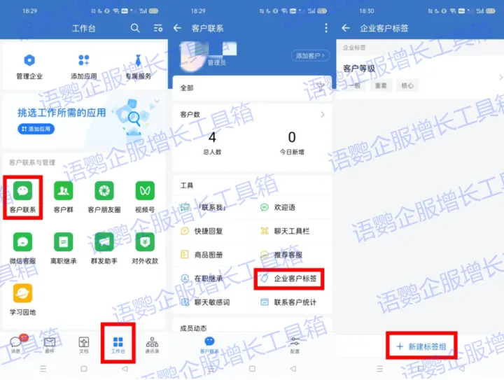 企业微信标签分为企业标签和个人标签,要对客户进行标签化管理,就需要先进行标签设置,首先是企业标签设置,管理员进入管理后台先对企业客户标签设置,手机端操作步骤如下:在工作台界面选择【客户联系】——选择【企业客户标签】——选择【新建标签组】即可。