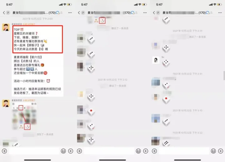 有时候不一定要策划大型的社群活动,不妨学习麦当劳,日常在群里发一些互动小游戏。通过趣味互动玩法,给客户赠送小食、甜品券,领到券的客户需要到门店消费任意产品使用。例如扔骰子、找茬、拼手气领红包、表情包斗图、答题互动等。