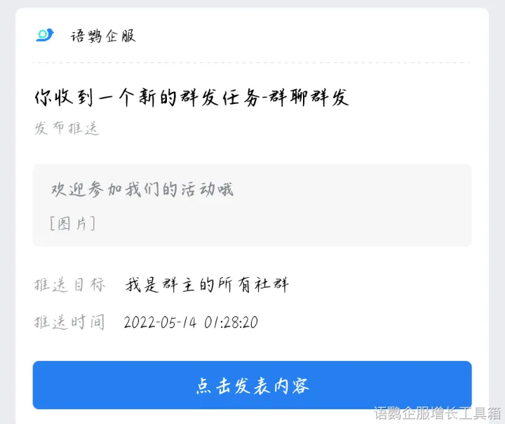 可使用语鹦企服【定时群发SOP】功能,做好互动内容计划,提前设置好文案和发布时间,每天定时提醒员工发送互动内容,提高社群活跃度。