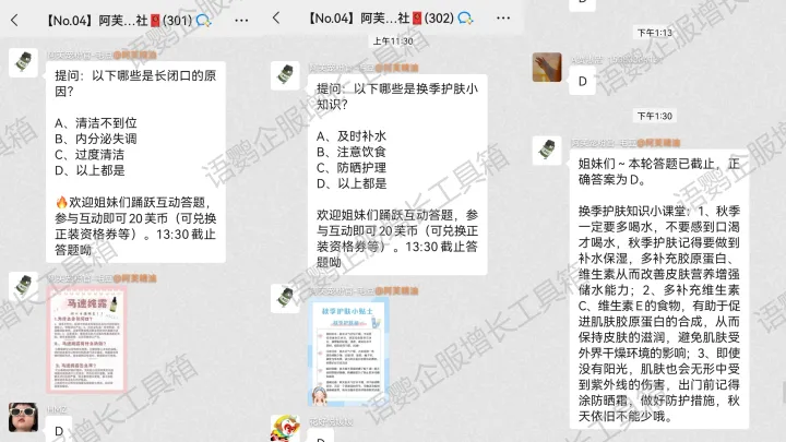 社群互动是非常必要的,如果只有运营人员一直在群里发活动内容而无人回应,基本上很难达成转化。阿芙精油除了在群内推送活动外,还通过“每日问答有奖+护肤小知识分享”的模式,用户参与互动即可获得20芙币,可用于兑换正装资格券。