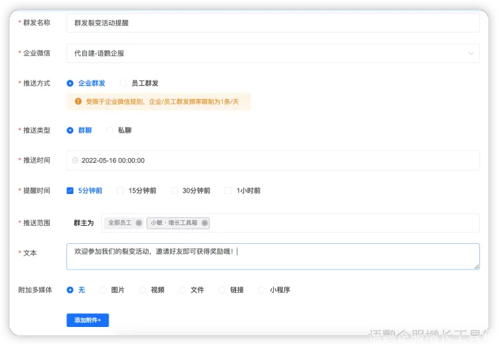企业在企业微信群发功能的次数限制下应更合理的制定群发计划,最大化地有效利用每月的群聊次数,可以使用语鹦企服的【定时群发sop】功能提前制定每月的群聊和私聊的群发计划,还可以根据不同顾客标签进行精准营销,支持群聊和私聊以及朋友圈群发三种形式,提高工作推进效率。
