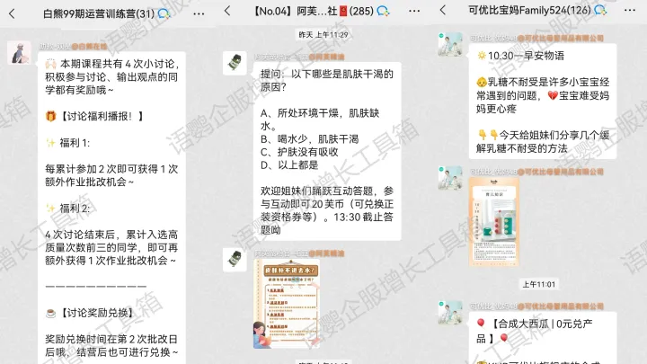 用户进群后,必须马上让用户明白该群的性质、玩法规则、好处,使用语鹦企服【入群欢迎语】功能,用户进群自动发送欢迎语和规则,可通过新人福利/领券优惠等小活动先把新用户留存在群里。