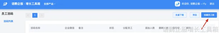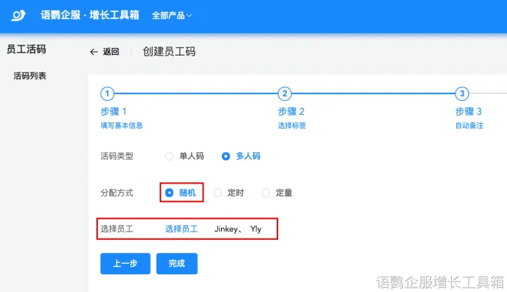 可以按照以下步骤使用语鹦企服工具箱来创建员工活码:点击【创建员工码】,进入创建页面,主要有四步:填写基本信息→选择标签→自动备注一选择销售分配方式一完成。