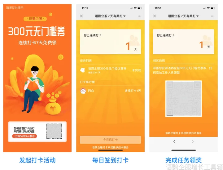 只是单向地输出内容,往往难以将客户留存,服装店需要定期做社群活动与客户互动。例如群签到打卡活动,使用语鹦企服【群签到打卡】功能,连续打卡N天可获得无门槛优惠券、服装单品等,还可设置阶梯式奖励,例如打卡7天获得小额优惠券、打卡15天获得大额优惠券、打卡30天获得服装单品,阶段性奖励让用户更容易坚持到群打卡,提高活跃度。