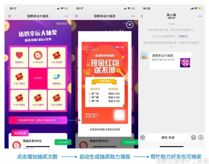 语鹦企服的【私域专属】功能不仅可以设置仅好友可参与,同时还可以设置为仅企业微信社群成员可参与抽奖的模式。语鹦企服的抽奖系统会自动辨别扫码客户是否为企微员工好友或者是社群成员,如若不是,则会引导客户添加好友或者扫码进群。语鹦企服的【私域专属】功能,是企业避免羊毛党薅羊毛的得力助手。