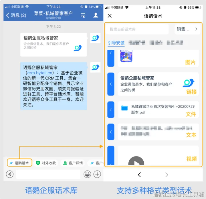 企业还可以设置专门的话术库收录在日常服务中客户的高频问题,这样在日常问答服务时,员工也可以更加快速地对客户的问题进行反馈。这种方式就是我们说到的语鹦企服增长箱中的【个性化话术库】快捷回复功能。语鹦企服的话术库不仅支持文本类型的话术库,同时支持图片、网页、链接、群聊、文件、视频等多种类型,且支持分组和快捷搜索。一次配置即可同步到企业微信侧边栏,并支持不同部门单独配置不同的话术库,均有利于提高新客户应答效率。