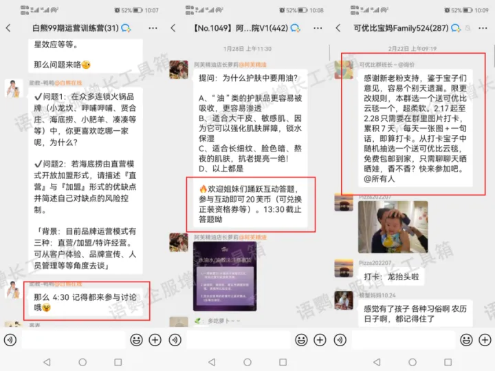 因此,做好日常的话题互动十分重要,可安排几个水军号响应话题,带动讨论。不同类型的社群有不同的话题互动模式,例如课程学习类社群可安排课题内容讨论,参与讨论的用户额外获得作业点评机会;美妆护肤社群可通过变美知识问答让用户参与答题,获取积分;母婴社群鼓励妈妈晒娃,连续晒娃赢奖品等。