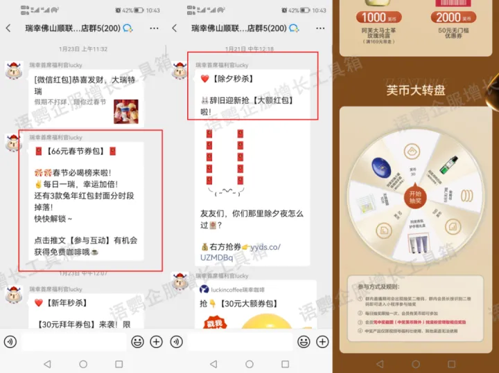 要么容易参与,要么奖品丰厚,总要让用户有参与活动的理由。只有能刺激用户参与的才是有效活动,才能调动私域用户的活跃度。在众多活动中,抽奖几乎能在各种场景中应用。使用语鹦企服【大转盘&九宫格抽奖】功能,大奖小奖都能设置,生成抽奖链接/二维码后,可一键发送至群内,又可在用户完成任务后私发。