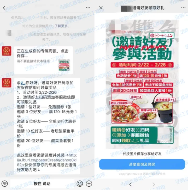 企业可以通过一些好友邀请的活动鼓励客户转发邀请,成功邀请好友完成相关任务即可获得奖励。许多企业通过使用语鹦企服的【好友裂变】功能,可实现客户再添加企业微信之后能自动获取活动规则并生成专属海报,能很好地提升客户体验感,更容易达到裂变拉新的目的。