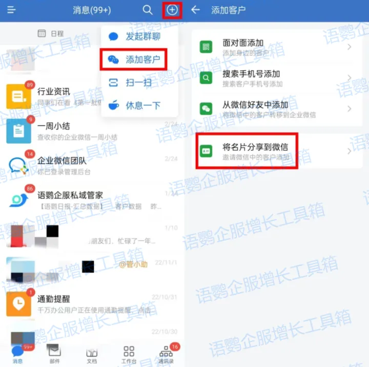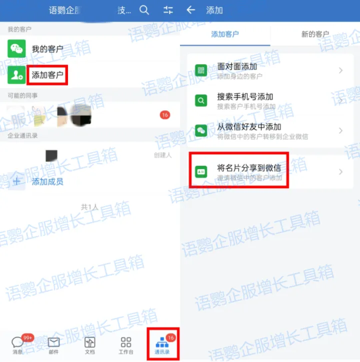 2.选择【通讯录】——选择【添加客户】——选择【将名片分享到微信】即可。