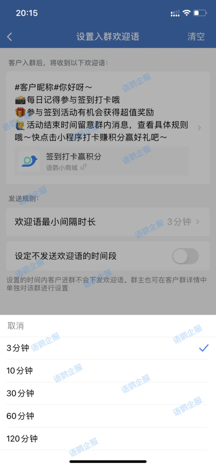 所以在企业设置入群欢迎语时需要根据入群情况自动调节好入群欢迎语的频次,避免因为过度频繁的发送信息造成成员退群或者因为欢迎语间隔太长导致活动通知不及时等情况。