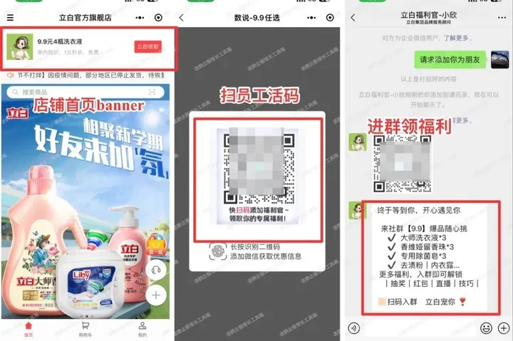 线上商场也可以实现创意拉新,比如立白的小程序线上商场,首页banner就会有9.9得4瓶洗衣液的新人福利,这就是私域当中的钩子,用来拉新的诱饵。点击立即领取就会有员工活码出现,最后通过福利官帮你进群领福利。