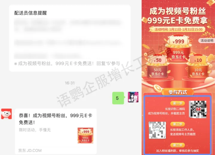 京东的视频号吸粉的方式就很直接明了,通过服务号发起的活动通知,点击链接后会有扫码加关注的海报,再添加京东的工作人员的企业微信号,成为其好友并入粉丝群。这一系列的操作其实最原始的吸粉方式,但是京东的奖励比较诱人,会有机会抽到999元的京东e卡,我们知道京东e卡是可以在京东商场直接消费的,这就相当于白给钱。这种奖励谁会不想要呢?