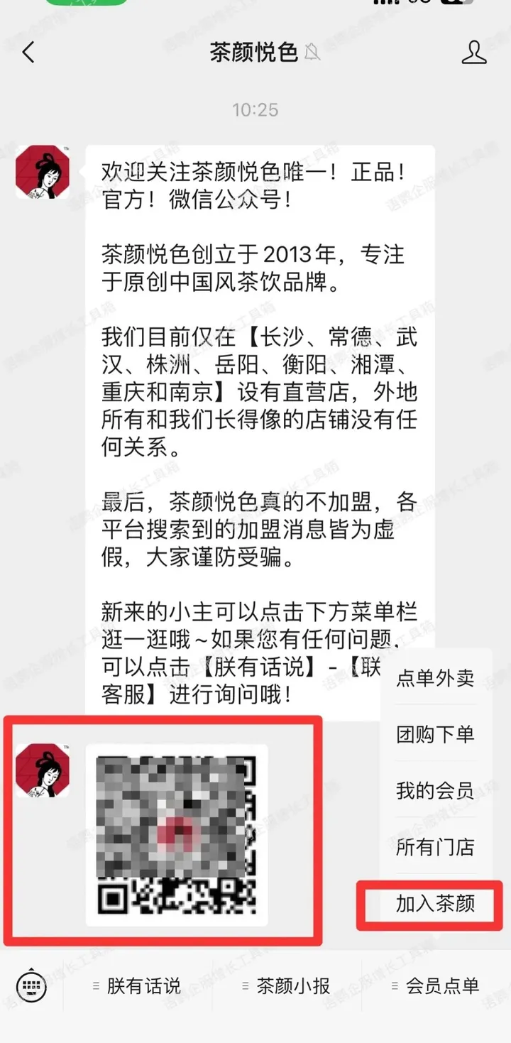 公众号拉新需要庞大的矩阵,通过公众号优质内容吸引客户、活动引流转化。比如茶颜悦色的公众号内容主打原创、结合热点、内容优质,主篇阅读量基本都是10w+。同时,茶颜悦的公众号矩阵庞大,点击「加入茶颜」就会有「员工活码」自动弹出。