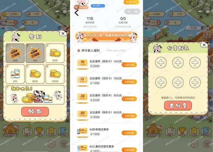 比如认养一头牛制作的小程序游戏,可以通过游戏的方式打造牛舍、集奶卡、用奶瓶换优惠券,分享有礼实现创意拉新。这种用游戏任务拉新的玩法比较新颖,且用户忠诚度比较高,能让客户主动拉新。