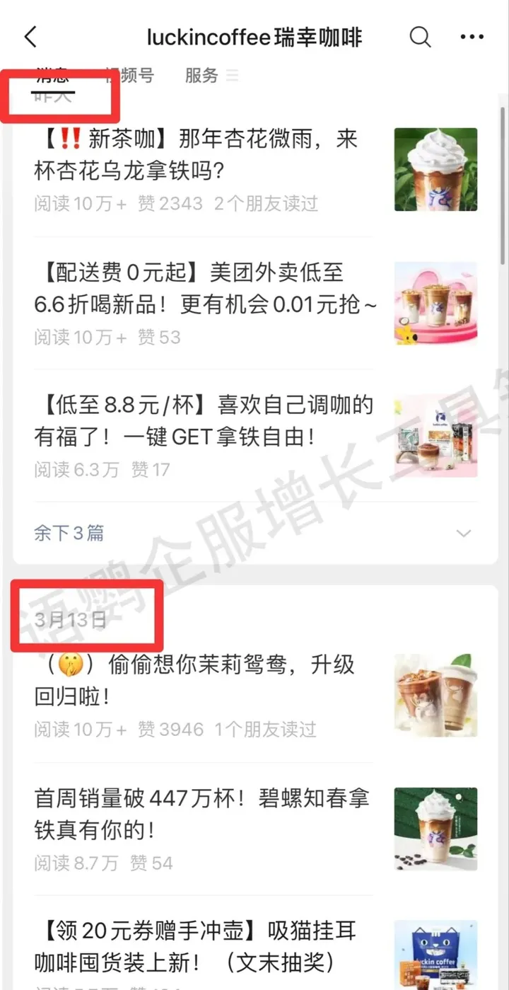 除了要保证内容的质量以外还要确定内容的发送,固定几个时间段将内容推送给客户,这样才能确保发文质量和数量。瑞幸咖啡的公众号会每隔一周发6篇文,且内容设定都不一样。