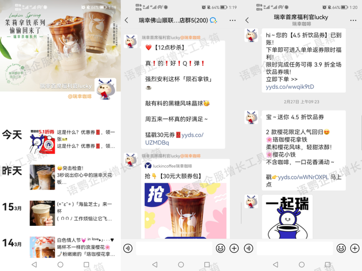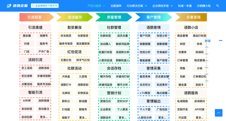 在企业微信的基础上,还可搭配第三方SCRM工具,让引流→促活→转化→客户管理等一系列私域运营工作更便捷、更有效。以语鹦企服为例,使用带参【员工活码】代替企微二维码引流,“多人码”功能解决客户流量过大的难题;使用【定时群发SOP】、【群签到、抽奖】功能促活转化;使用【标签管理】功能将用户分类,实现精细运营。