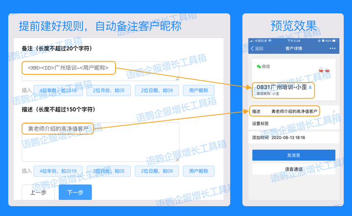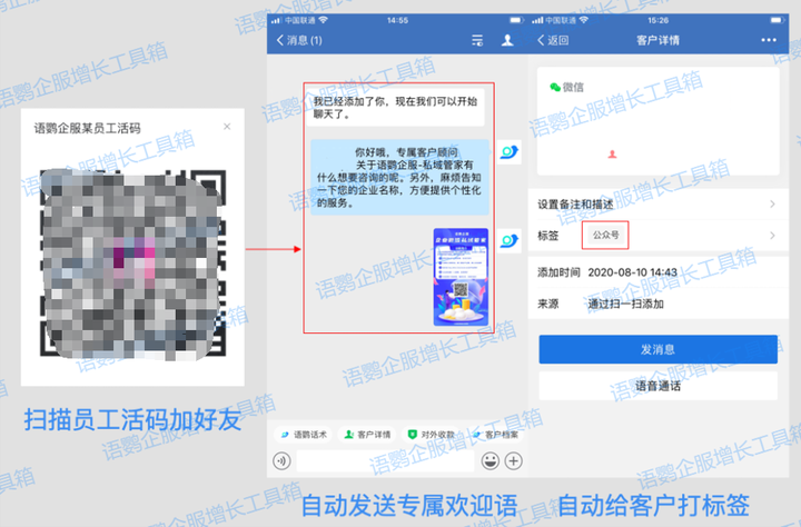 企业只需通过语鹦企服生成员工活码,客户扫描活码名片并发送好友申请的一瞬间,就可以实现以下4项自动化操作,便于后续精细化运营: 自动双向加对方为好友. 自动给对方发送应答欢迎语(可附上入群邀请/优惠券等信息)自动打上原先按规则设定好的标签。自动将对方拉入相应的客户群。