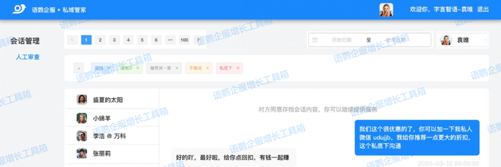 但是我们可以选择语鹦企服的「会话存档功能」,即买即用,省去开发的成本,而且还具备企业微信会话存档所欠缺的高级功能,能更好更方便地管理企业微信上的聊天记录。