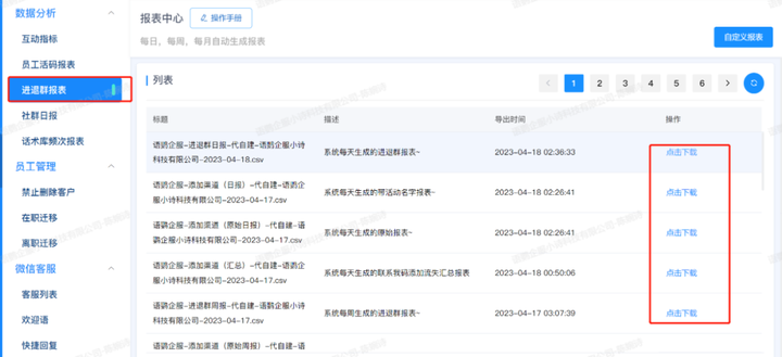 群退群率:这个指标反映了用户对群内容和运营的认可度和满意度。如果退群率过高,说明群内容或运营有欠缺,需要进行调整优化。可通过语鹦企服【数据分析-进退群报表】查询,报表上清晰列明进退群发生日期、群ID、群名称、群主、群主ID、进群人数、退群人数等。