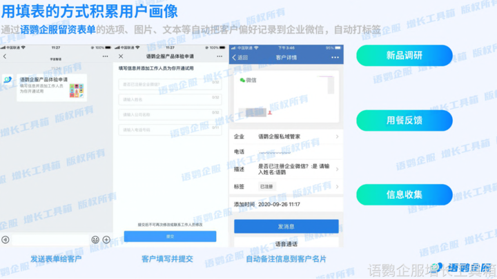 用户画像:通过群成员的资料信息可以了解到他们的年龄、性别、工作、学历等属性信息。了解用户画像可以制定针对性策略,更好地进行精细化运营。可以使用语鹦企服【留资表单】,通过表单的选项、图片、文本等自动把客户记录到企业微信,自动打标签,积累用户画像。