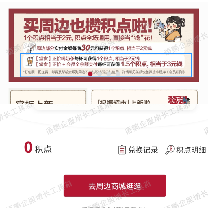 此外,还可设置到店消费比线上消费享受更多权益,鼓励用户多去门店。例如茶饮品牌“茶颜悦色”的点单小程序中,堂食正价购买奶茶每杯可获得“1积点”,正价+会员全余额支付每杯可获得“1.5积点”,1积点=2元,可直接当“钱”使用。