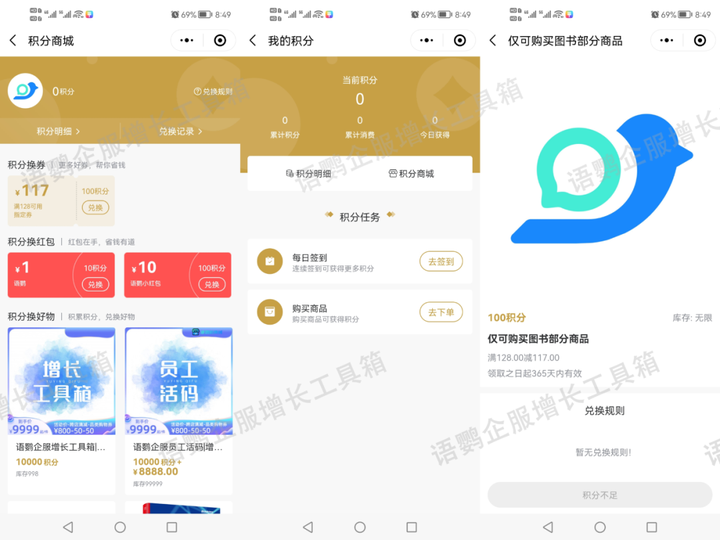 利用私域电商,建立与消费挂钩的会员积分体系。用户在【语鹦小商城】通过完成签到、消费晒单等任务即可获得相应积分,积分又可在【积分商场】中兑换优惠券和小礼品,形成“消费→积分→消费”的良性循环。让用户与品牌深度绑定,一定程度上保证了复购率。