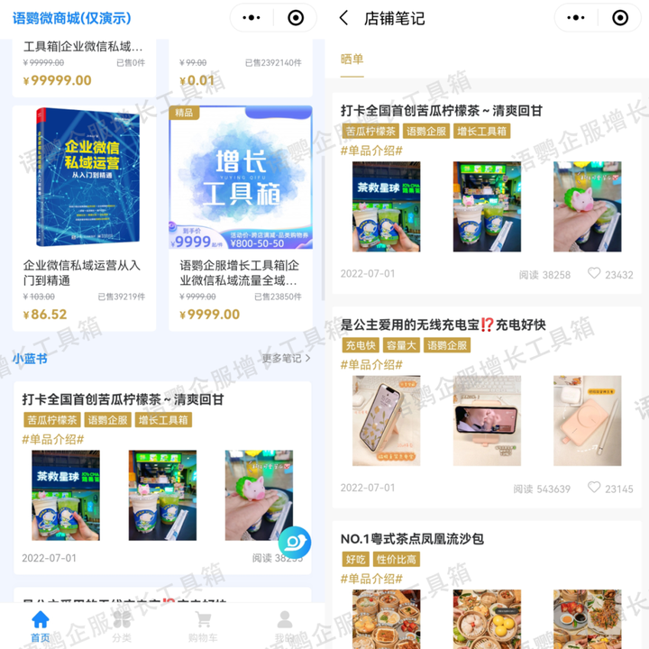 更进阶的玩法是利用私域电商中的社区板块——【语鹦小商城】的“小蓝书”社区,发起到店打卡晒单活动,晒单用户可参与抽大奖,以此刺激用户到线下门店消费并分享到社区,同时对其他线上用户起到种草作用。