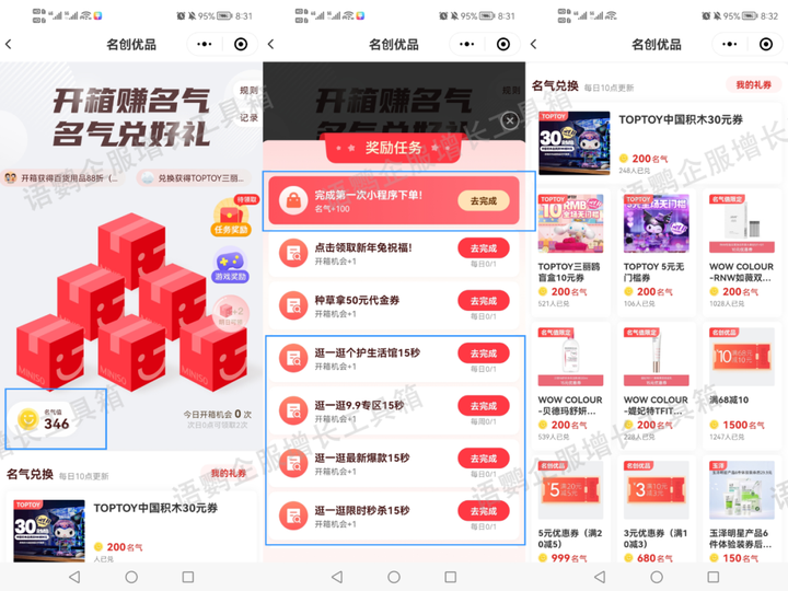实际上,在各类积分任务当中,产生消费的门槛是比较高的,许多新用户基本不会为了获得积分而直接下单。因此,快消品牌“名创优品”在设置任务时,还增设了“浏览XX页面XX秒”的任务,完成任务可获得开箱机会,随机获得“名气”或“优惠券”,“名气”可用于兑换礼品。门槛降低后用户更易完成,也可能在浏览过程中被种草,完成首单直接获得“名气”积分。