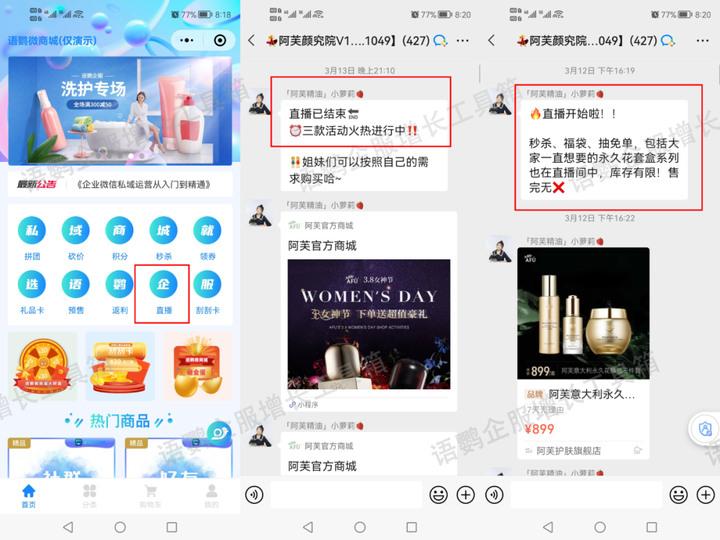 通过视频号或【语鹦小商城】直播功能进行直播种草,引导用户在商品口袋下单。与公域电商直播相比,私域直播能够更直接地触达目标用户。例如直播前在朋友圈/社群/公众号预告,直播中在社群实时提醒进直播间参与“领红包”、“抽奖”、“领小样”等活动。直播后总结福利内容进一步宣传,吸引用户参与下次直播。