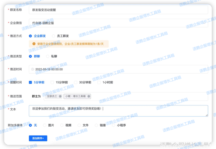 另外根据社群运营目标和策略,灵活选择其他类型的内容进行周期群发,如活动通知、调查问卷、客户故事等,分享形式主要是文字/海报/链接/文件内容,普通的企业微信功能暂时无法做到这一点,这时候我们可以使用语鹦企服定时群发SOP来进行相应发送能够设置不同的附件包括图片小程序等,以保证客户群体收到不一样的客户体验,从而对公司有依赖感。