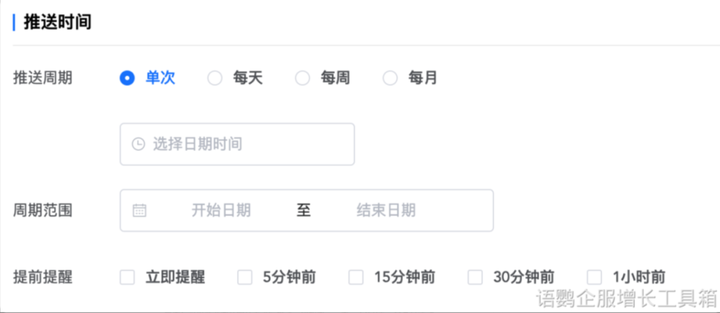 在语鹦企服会话管理界面中,选择推送方式、类型和时间后就可以选择员工进行发送了。在相应时间中,系统便会提示员工需要发送的时间以及内容形式。周期与群发可以选择单次、每天、每周、每月等,多选时间点发送。还能设定周期范围,超出范围就不再重复,同时也可以提前提醒,在需要发消息的时候提醒员工,员工确认后群发,最多可提前一小时。