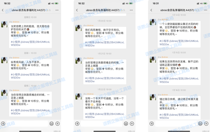 由于群发能深度触达客户群体之间,我们可以方便地培养、维系与用户之间的感情,增加用户对品牌的认知度,提供有温度的服务。比如输出日常关怀类内容,如早晚安问候、节日问候、天气变化提醒等。