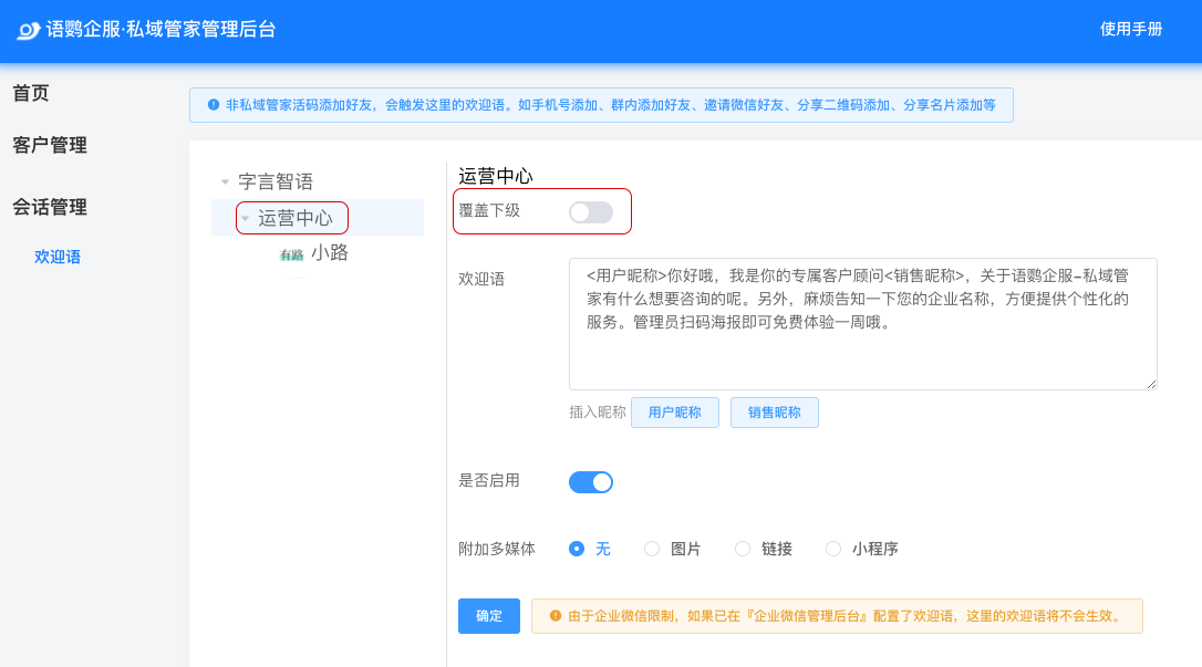 比如我选中【运营中心】这个部门,即可设置整个部门的欢迎语,如果同时开启了【覆盖下级】按钮,那么这里设置的欢迎语就会对该部门下所有的子部门生效。