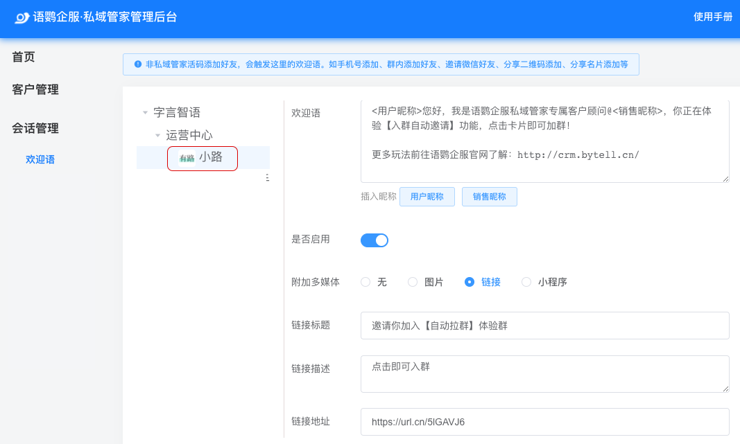 使用语鹦企服私域管家-会话欢迎语功能,即可实现单独欢迎语,并且还有以下明显优势: