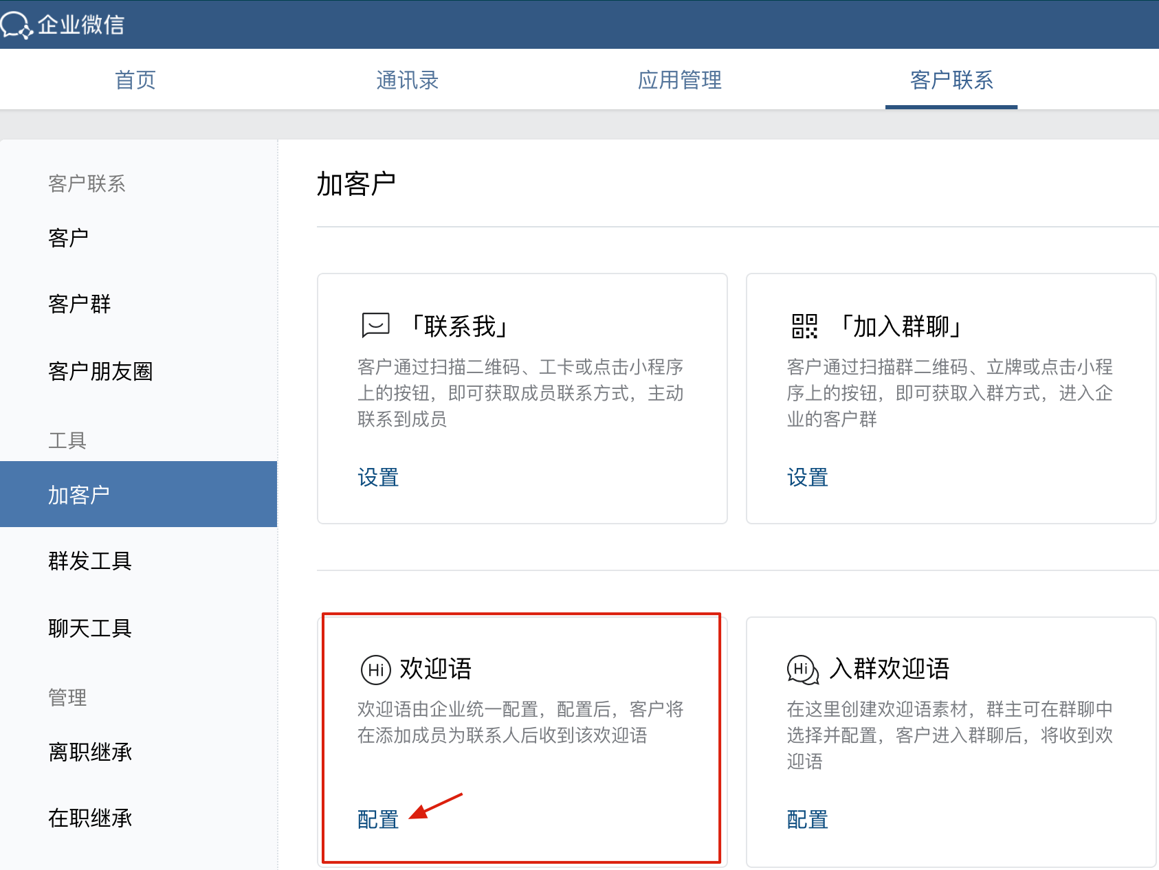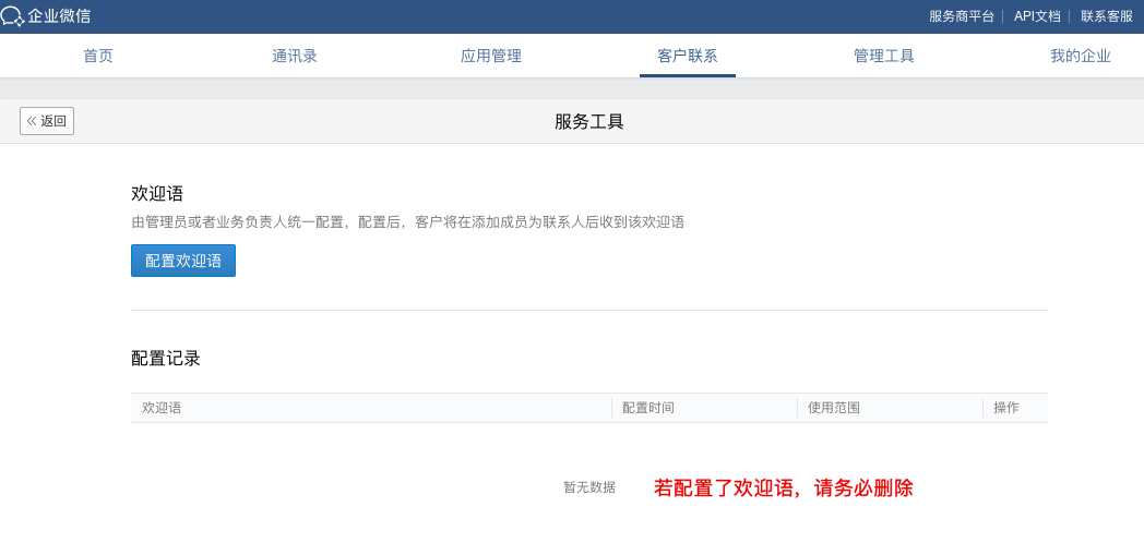 1.完成以上设置后,记得登录企业微信管理后台,查看【客户联系-加客户-欢迎语】模块是否设置了欢迎语,有的话请务必删除,否则语鹦企服欢迎语会失效。