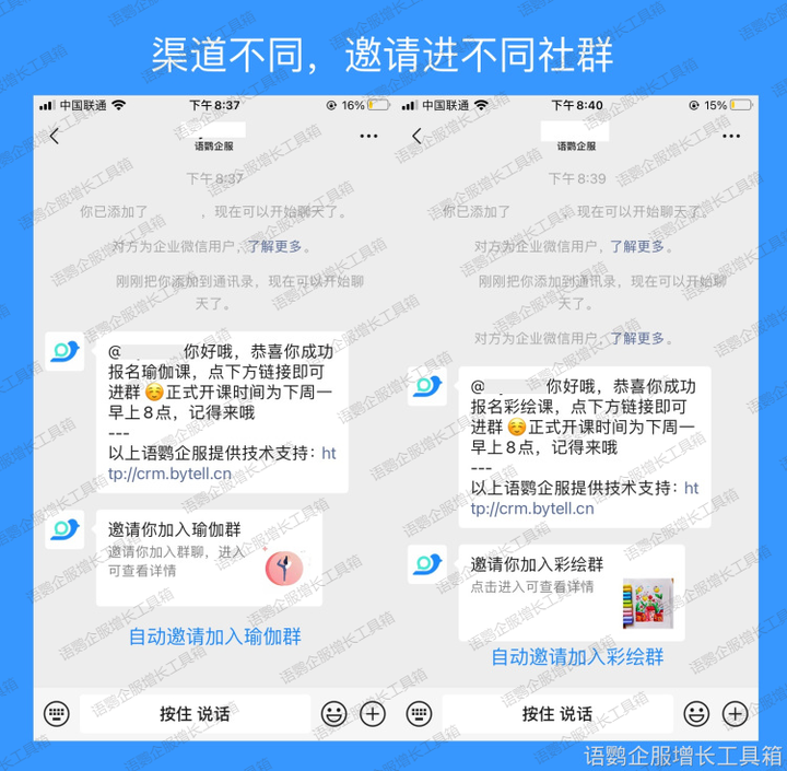 除此之外,设置不同的欢迎语,给到客户不一样的优惠或活动政策,还能自动给客户自动邀请进入社群,再也不需要人工审核区分客户来源,从而达到高效组建社群的效果。组建社群后,可以为客户带来更多营销玩法,提高互动记录,为后续优惠或活动宣发奠定粉丝基础。