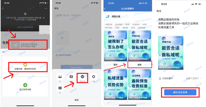 如果企业管理员需要将视频号内容通知到企业所有员工群发到朋友圈,则需要在工作台- 客户朋友圈- 点击发布 – 选择创建内容通知成员发表- 选择视频号- 配上对应的文案后即可点击通知全体成员发布到客户朋友圈。