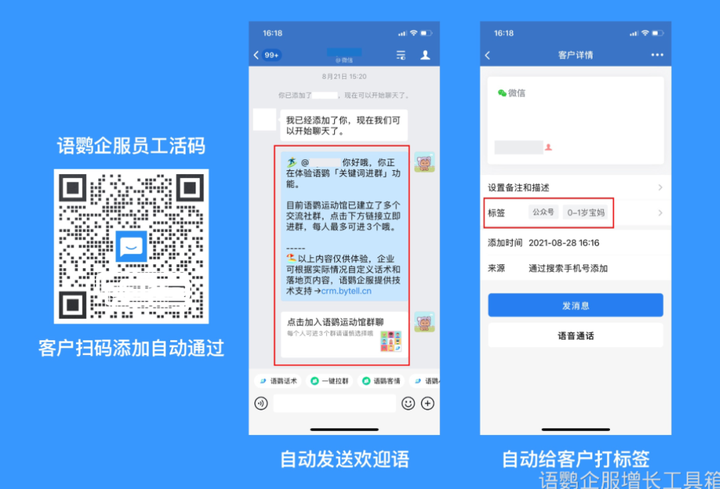 企业引流过程中,客户对企业的第一印象尤其重要。在联系的客户数量过于庞大的时候,为了提高与客户的联系效率,可以使用语鹦企服的“个性化欢迎语”功能来设置自动发送欢迎语,它可以根据不同部门、不同员工设置不同欢迎语,支持动态加上用户昵称和销售昵称,拉近企业微信与客户的距离感。