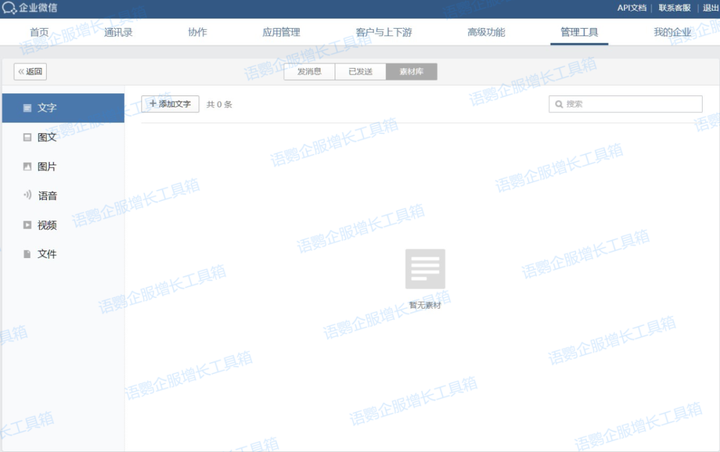 企业微信素材库可以在管理后台「管理工具」-「素材库」进入,添加和编辑素材。创建了素材后,仅素材的创建者和超级管理员可使用或编辑素材库,仅素材的创建者和超级管理员支持删除素材。