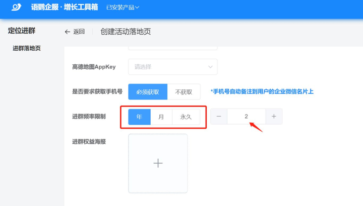 更重要的是,定位进群可以设置风控条件,在创建进群落地页时可以设置进群频率限制,限制同一用户在一定时间内进群的频率,维持良好的社群环境。