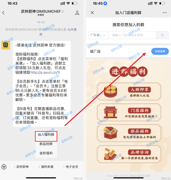 首先,定位进群功能支持设定门店周围一定半径范围的客户,将该范围内容的客户拉进门店社群,也可以设定「电子围栏」来圈定某个区域。其次企业设置定位进群后,可以将入群链接或二维码添加到官方公众号、海报等多个途径,一旦客户点击,系统会通过LBS定位,将客户匹配到最近的门店社群,比如图上的餐饮店武林厨神,在公众号的菜单栏设置了社群快捷入口,点进去后定位进群,用户便可以自动进入周边门店的群聊,节省步骤。