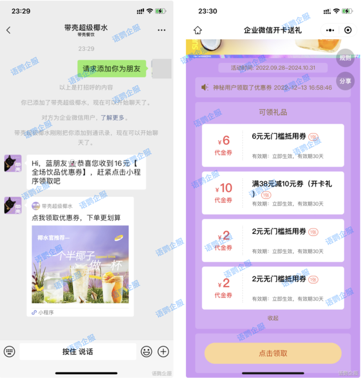 根据用户的分层和标签,进行个性化的内容推送和互动。通过定向发送专属优惠,提升用户参与度和满意度。比如针对从门店物料扫码添加过来的用户可以通过语鹦企服的个性欢迎语实现自动发放门店专属优惠券,用户可以直接领券下单,提升用户的下单体验。