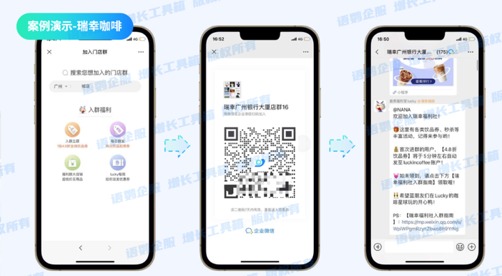 对于搭建社群的企业,可以创建专属的企业微信群或微信群作为社群平台。可以根据企业需求通过定位进群或关键词进群邀请用户将用户划分加入不同群聊,建立差异化的用户社群,提前优化提升群内成员之间的互动和沟通概率。比如像全国门店多的连锁品牌可以通过区域位置来设置群聊,比如瑞幸咖啡将用户引导最近的门店群聊,对门店周边流量进行管理。