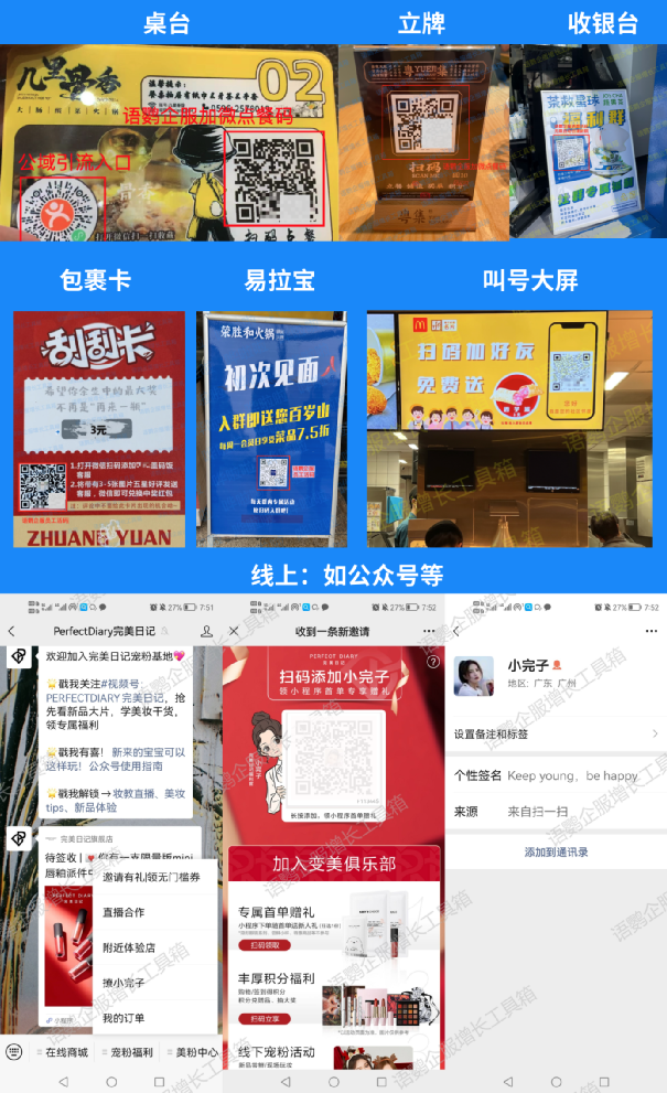 对于添加好友,在企业的各个线上和线下渠道,如官方网站、微信公众号、APP等,提供添加好友的入口。这可以是通过活码二维码、按钮或链接等形式,引导用户主动添加企业的微信号或企业微信号为好友,并根据对应的渠道贴好线上、线下的标签。
